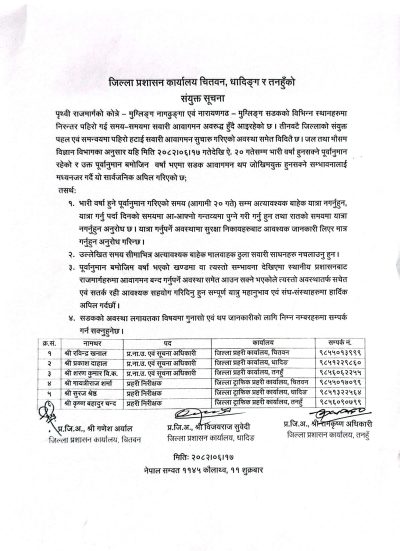 शुक्रबार चितवनको इच्छाकामना गाउँपालिका–३ चुम्लिङटारमा चितवन, धादिङ र तनुहँको सुरक्षा समितिको संयुक्त बसेको थियो । प्रमुख जिल्ला अधिकारी र सुरक्षा निकायका प्रमुख÷ प्रतिनिधिको संयुक्त बैठक पश्चात संयुक्त सूचना जारी गर्दै असोज १७ देखि २० गतेसम्म रातीको समयमा सवारी चलाउन भनिएको छ । पृथ्वी राजमार्गको कोत्रे–मुग्लिङ–नागढुङ्गा र मुग्लिङ–नारायणगढ खण्ड सडकको विभिन्न स्थानमा निरन्तर पहिरो झरेर समय समयमा सवारी आवागमन अवरुद्ध हुँदै आइरहेकाले जोखिम रहेको सुरक्षा समितिको ठहर छ ।